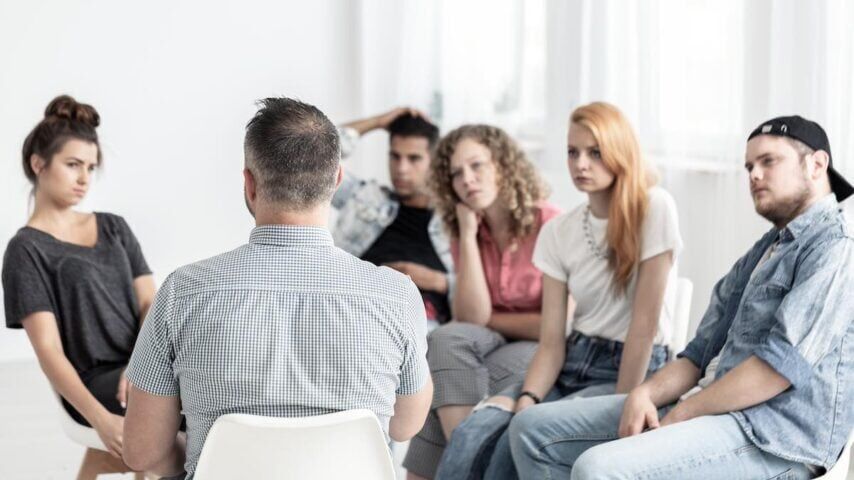 Group of young people/ teens talking to a psychologist in a rehab center